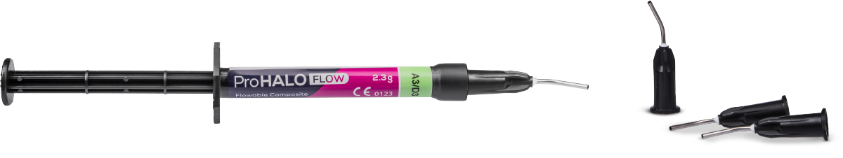 Può essere utilizzato come composito fluido per restauri di piccole dimensioni di 1° classe e restauri di 5° classe e come fondo di cavità prima della stratificazione di ProHALO.