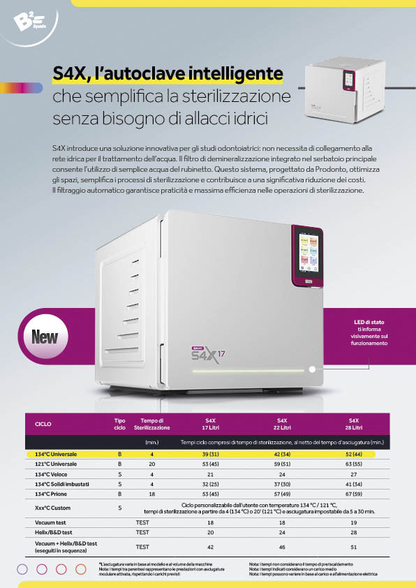 S4X introduce una soluzione innovativa per gli studi odontoiatrici: non necessita di collegamento alla rete idrica per il trattamento dell’acqua. Il filtro di demineralizzazione integrato nel serbatoio principale consente l’utilizzo di semplice acqua del rubinetto. Questo sistema, progettato da Prodonto, ottimizza gli spazi, semplifica i processi di sterilizzazione e contribuisce a una significativa riduzione dei costi.